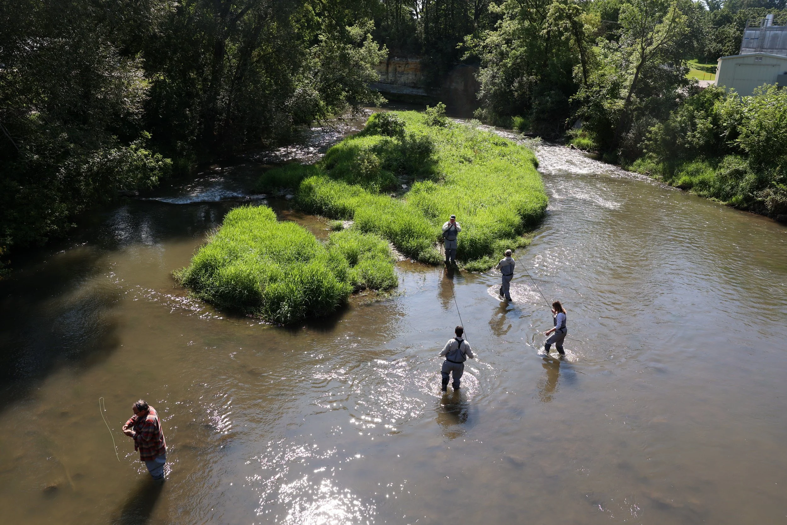 Mel Hayner, top, teaches a Fly Fishing 101 class down the street from his shop on the Root River on Saturday, Aug. 10, 2024, in Preston. “We have loyal people that come back and guide with us every year,” says Mel who started guiding in 2004. “Because we do a good job and we get five star ratings and our reputation is that we know what’s happening.”