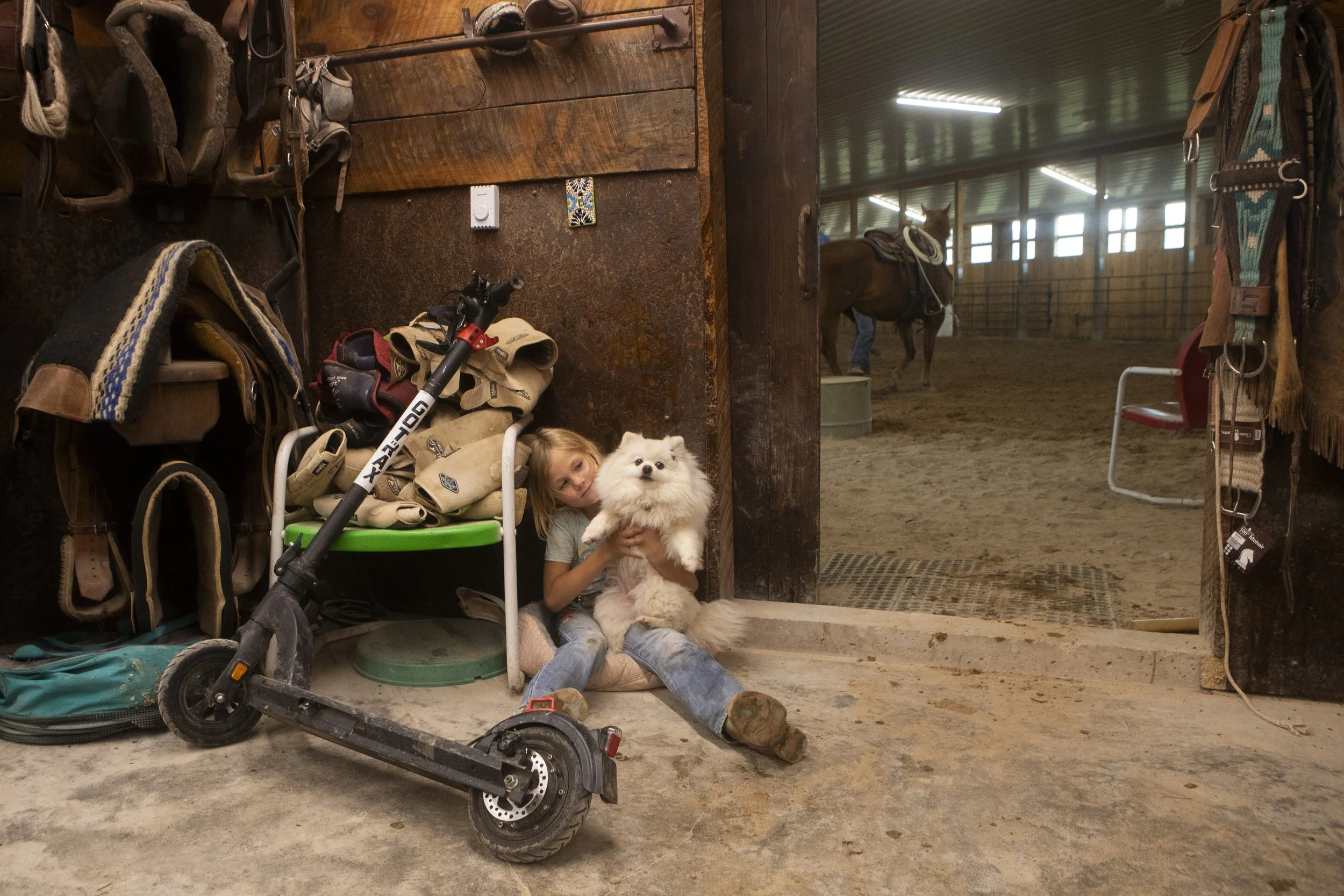 Blaisely Haugen, 8, holds the family dog, Pearl, on the Haugen family ranch on July 11, 2023, in Sturgis, S.D. Blaisely's entire family on both sides are ranchers and professional rodeo competitors, including her two older sisters Landry and Arina. When she is older she will follow suit and compete as well.