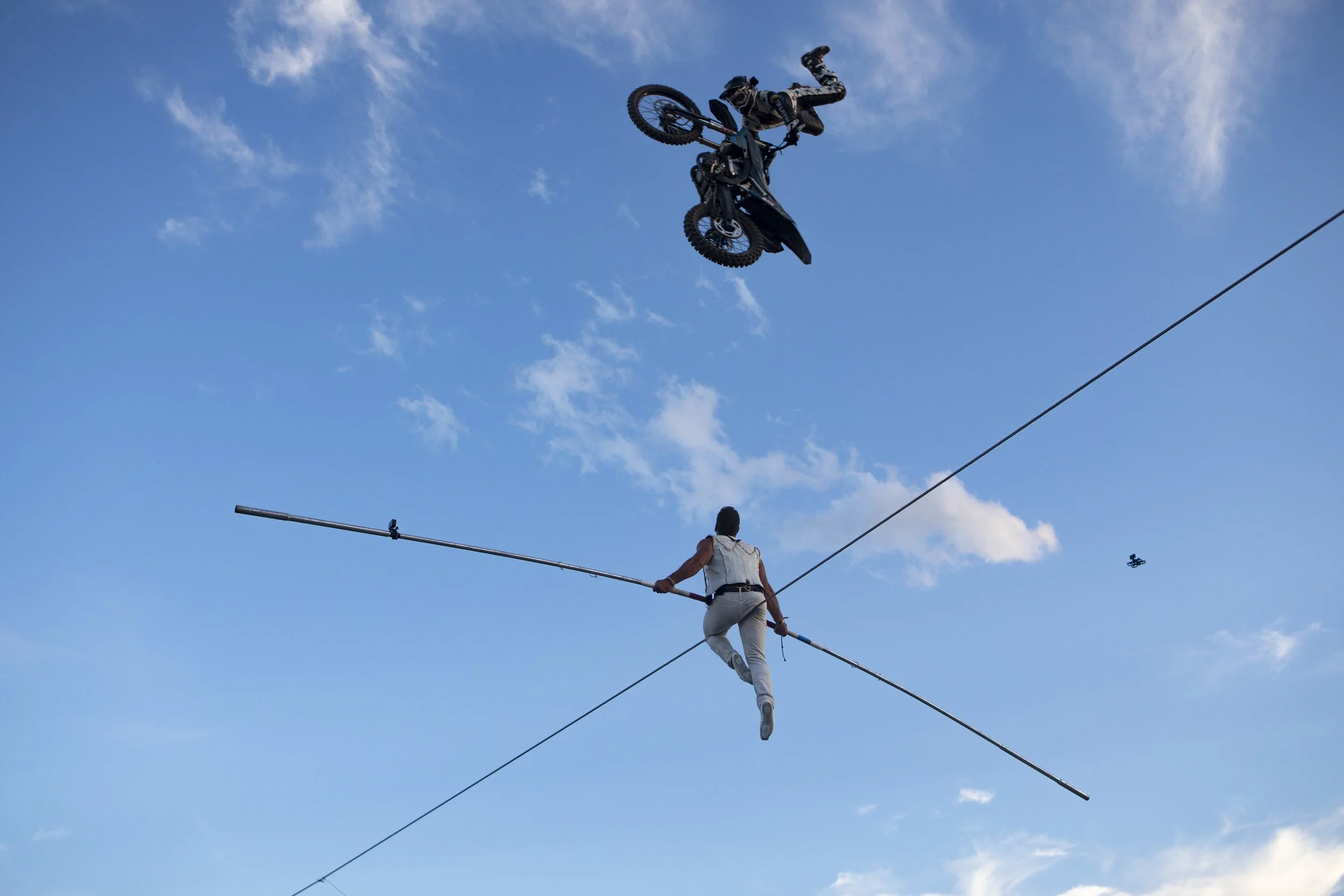 Blake Wallenda sits down on the high wire as Kyle Ives jumps over him during The Death Wire Daredevil Spectacular on Thursday, Aug. 10, 2023, during the 83rd City of Sturgis Motorcycle Rally at the Sturgis Buffalo Chip, S.D.