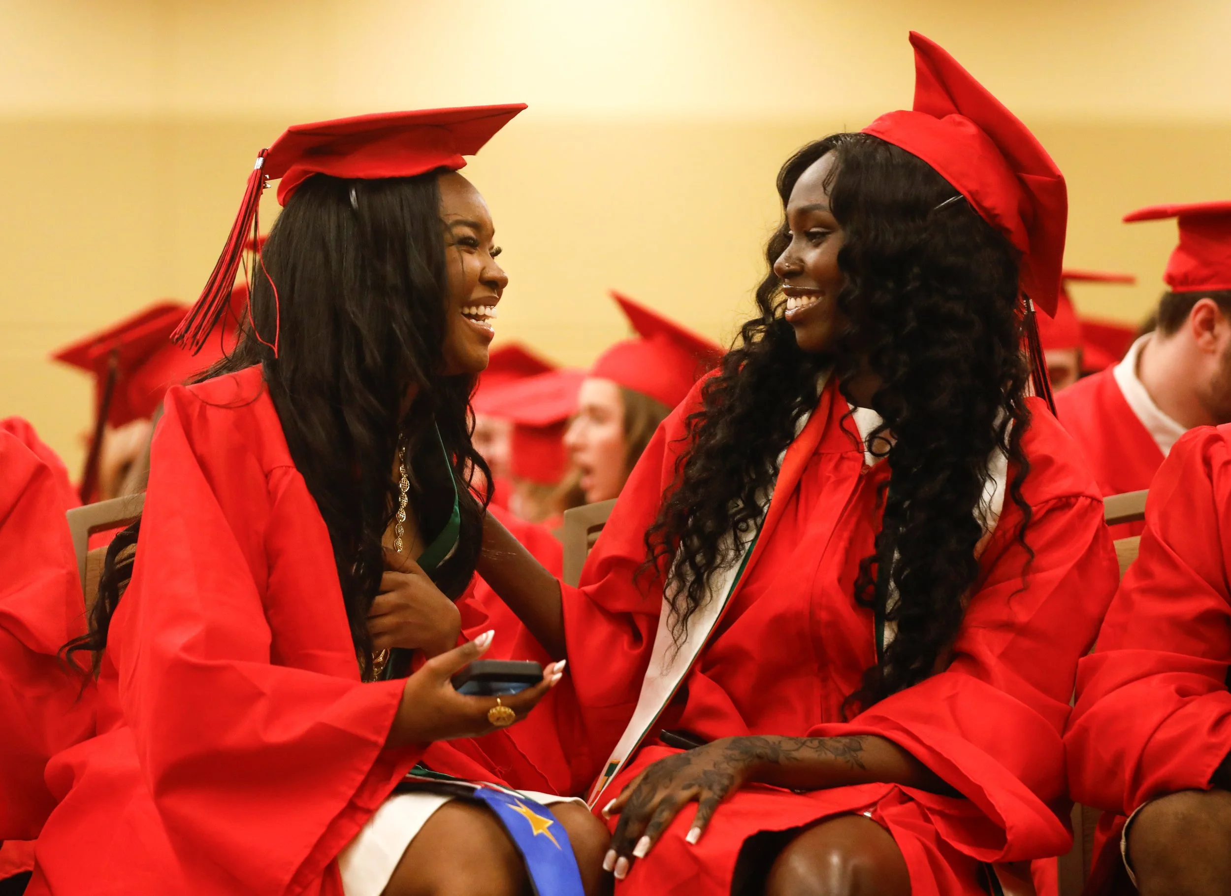 Sarah Abdalla, left and Wieth Bawar laugh with each other before John Marshall High School’s Class of 2025 Graduation Ceremony on Saturday, May 31, 2025, at the Mayo Civic Center in Rochester, Minn.