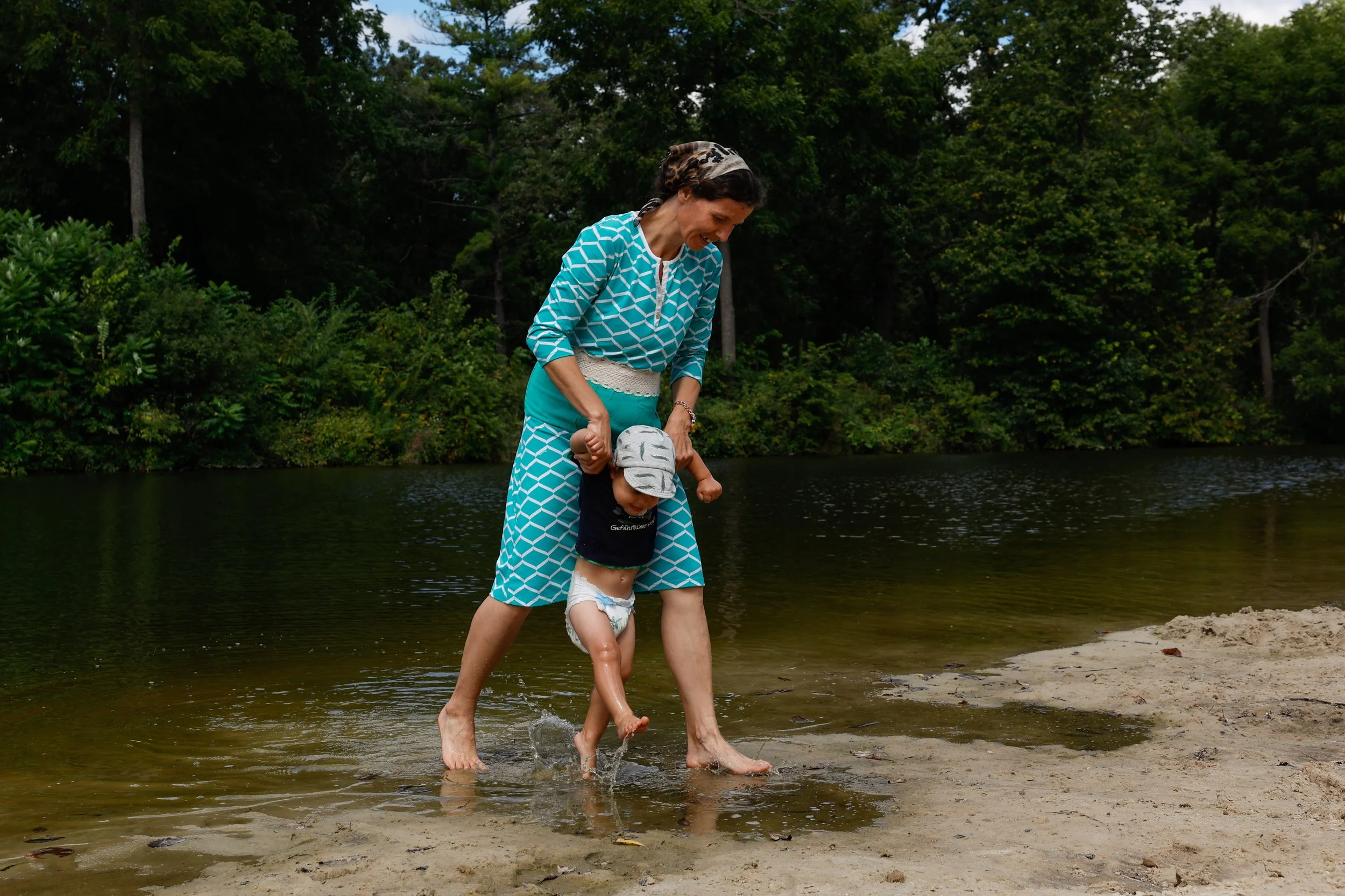 Hope Bac carries her son Micah, 18-months-old, out of the water on Saturday, Aug. 30, 2025, at Whitewater State Park in Altura, Minn.