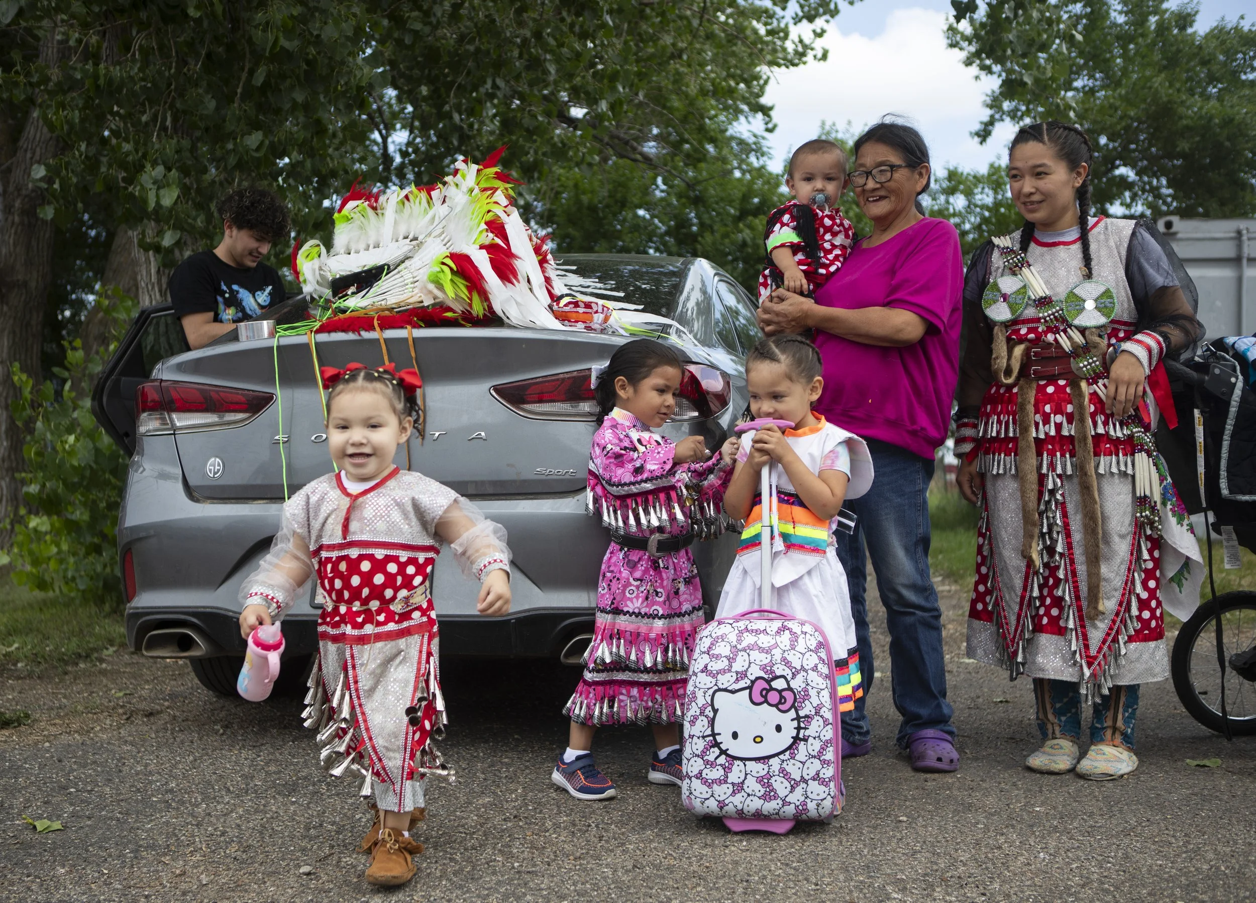 The Eagle family prepare to dance during the Lakota Dance Exhibition on Friday, July 7, 2023, at the 11th annual RedCan Graffiti Jam on the Cheyenne River Sioux Reservation in Eagle Butte, S.D. The Cheyenne River Youth Project hosts the event every year to bring families and youth together through art.