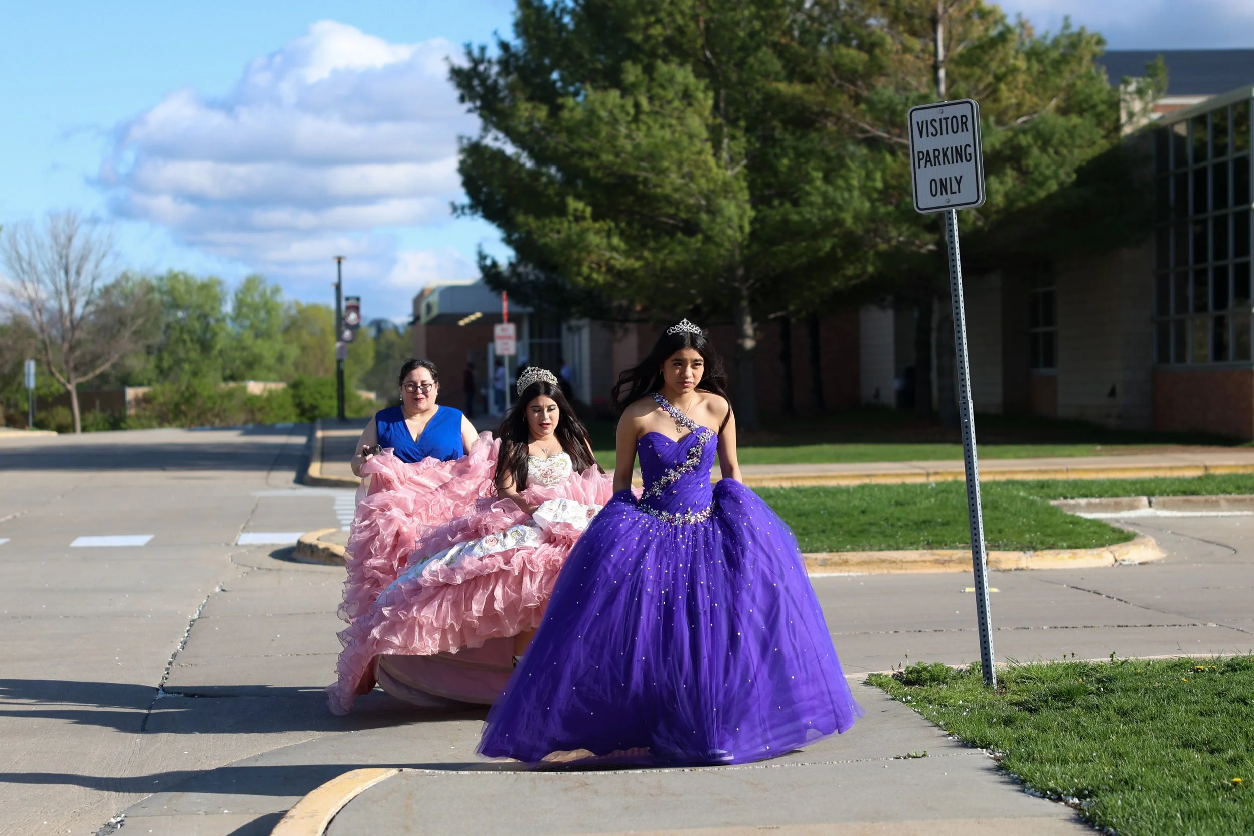 Kimberly Hernandez, front, and Ariana Becerra Rosas walk in their quinceañera dresses to take photos during a Quinceañera Themed Dance on Saturday, May 4, 2024, at John Marshall High School in Rochester, Minn. View fullsize