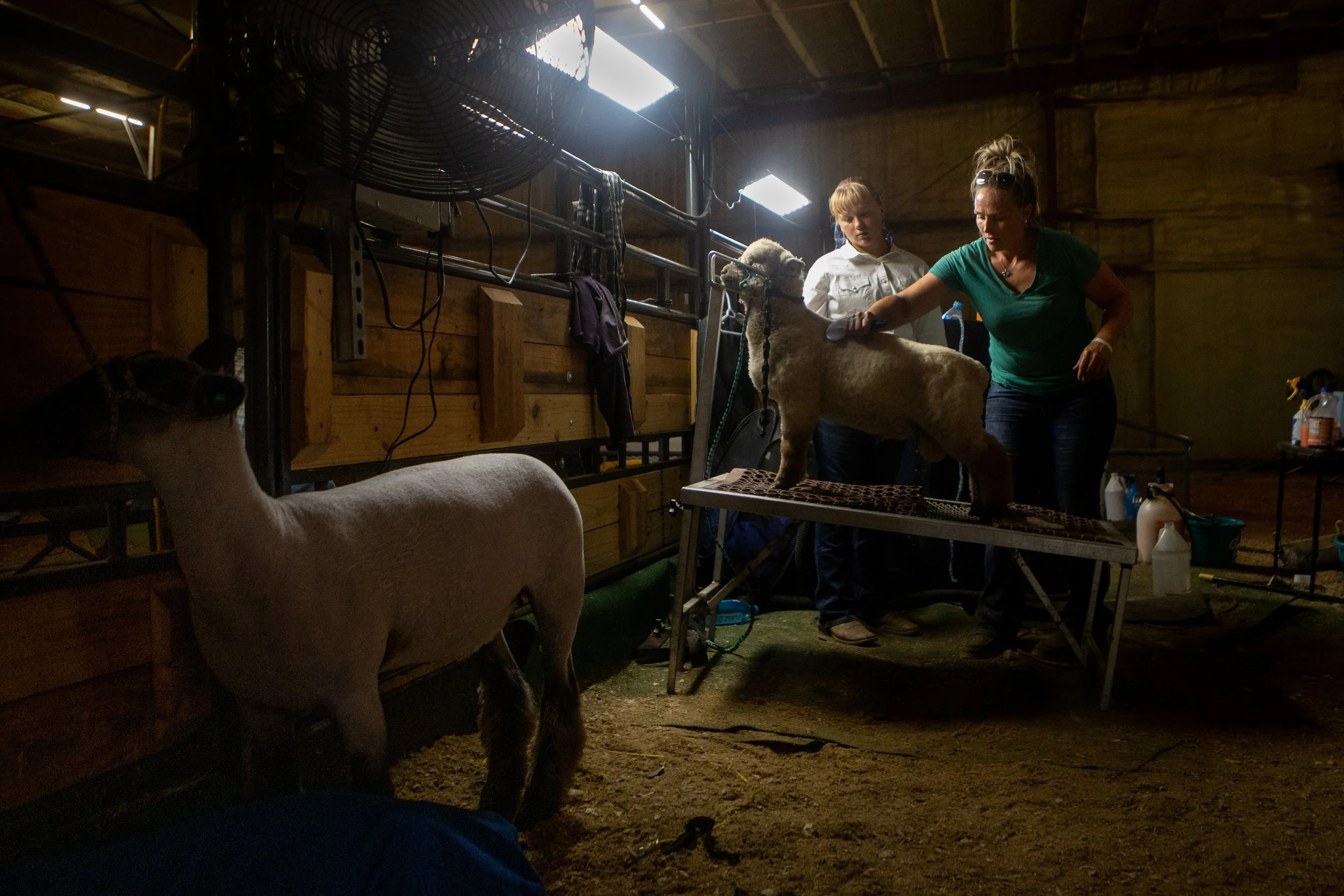 Josie Tish, left, watches as a volunteer shows her how to clean off her sheep, Bruiser, before competing in the Youth Livestock Show on Friday, Aug. 18, 2023, at the opening day of the Central States Fair in Rapid City, S.D. View fullsize