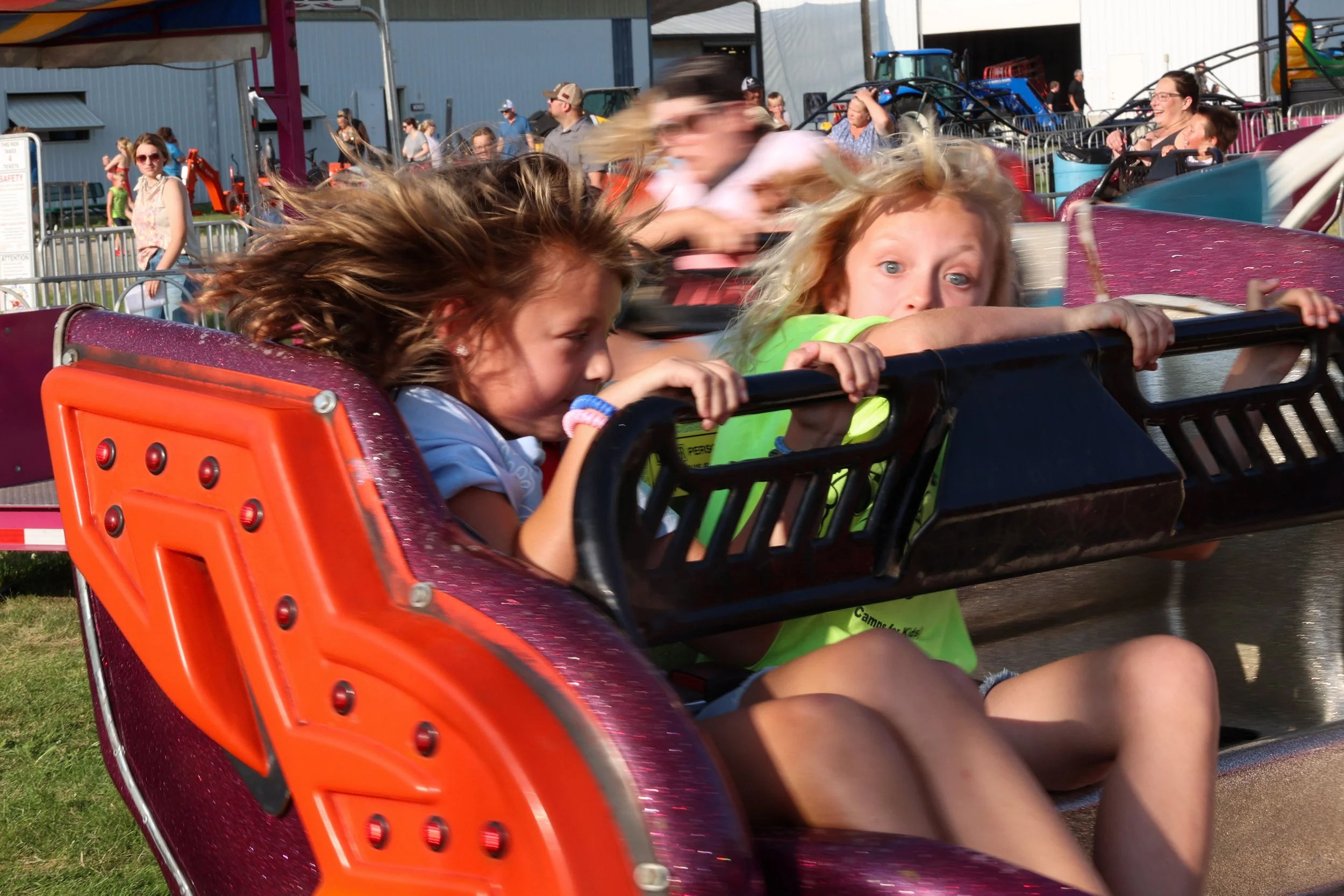Zoe Wolfe, right, and Reylyn Korder react to a fair ride during the Winona County Fair on Friday, July 12, 2024, at the Winona County Fairgrounds in St. Charles, Minn.