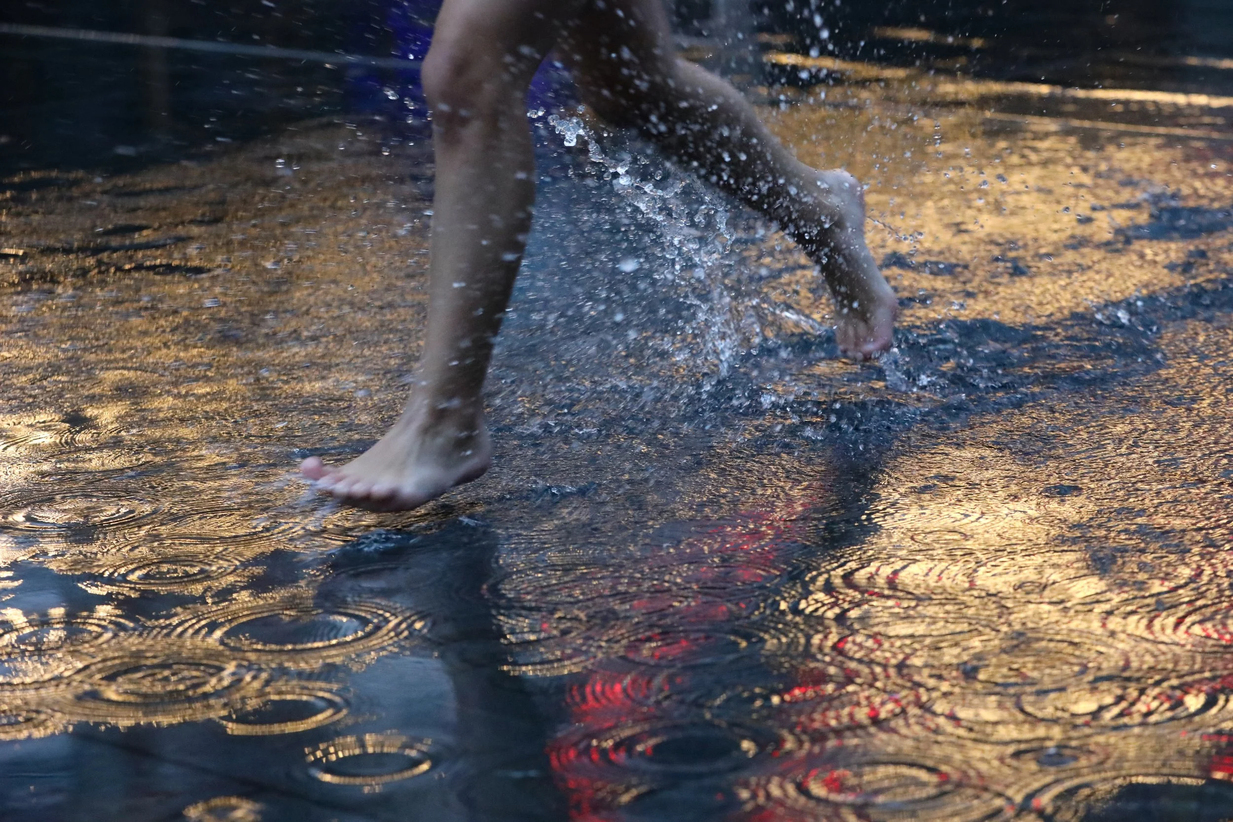 A child runs through the fountain at Peace Plaza during the first Thursdays Downtown on June 13, 2024, in Rochester, Minn.