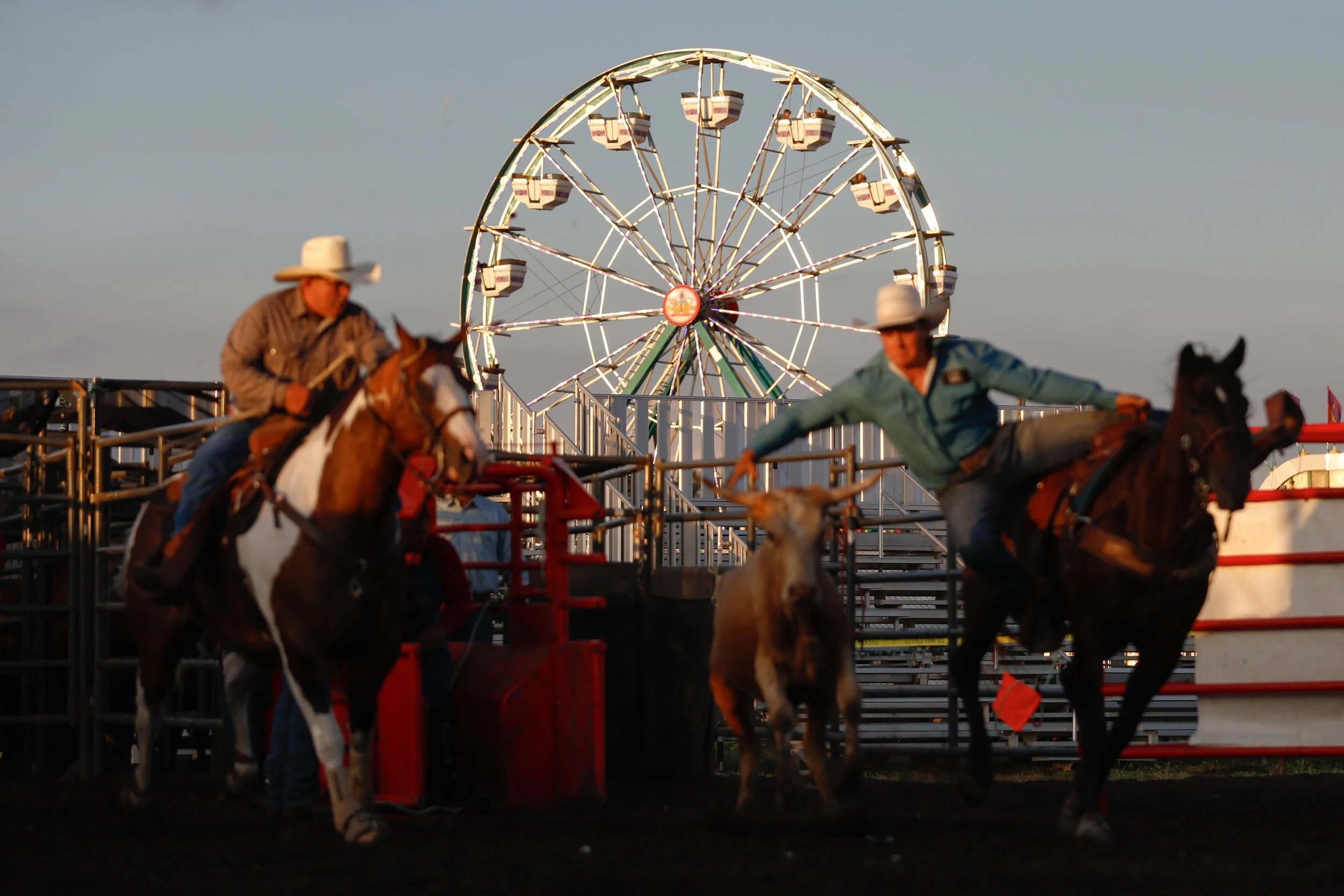 The ferris wheel is pictured while Tysen Proschel, of Mondovi, Wisconsin, competes in steer wrestling during the Bucking Wild Big Hat Rodeo on Thursday, July 24, 2025, at the Olmsted County Fair in Rochester, Minn. View fullsize