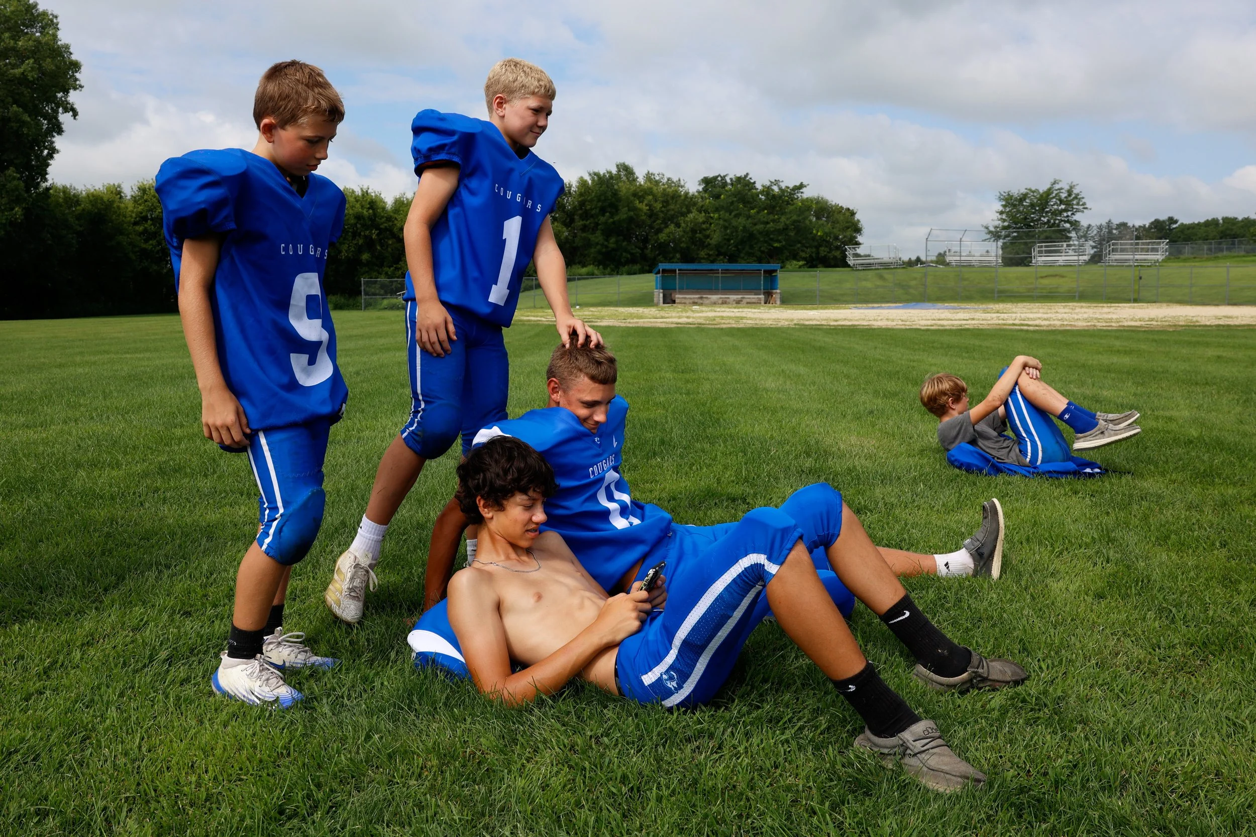 Mabel-Canton football players Henry Garness, left, Blake Eiken, top, Carter Hershberger, bottom, and Jayce Austin, right, relax before taking their team photo on Tuesday, Aug. 19, 2025, in Mabel, Minn.
