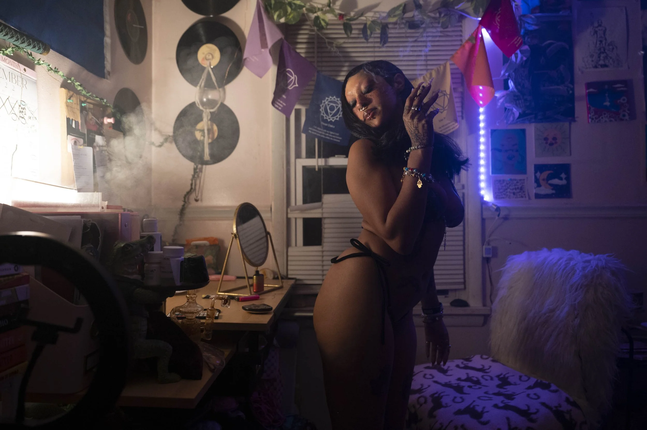 Roman Alexander Douset, 20, of Greece, N.Y., takes photos of themself prior to a photoshoot on Dec. 6, 2022. Roman has been an OnlyFans creator since they were 18 and views sex work to be empowering. They hope to promote positive and safe environments for women to work in the sex industry.