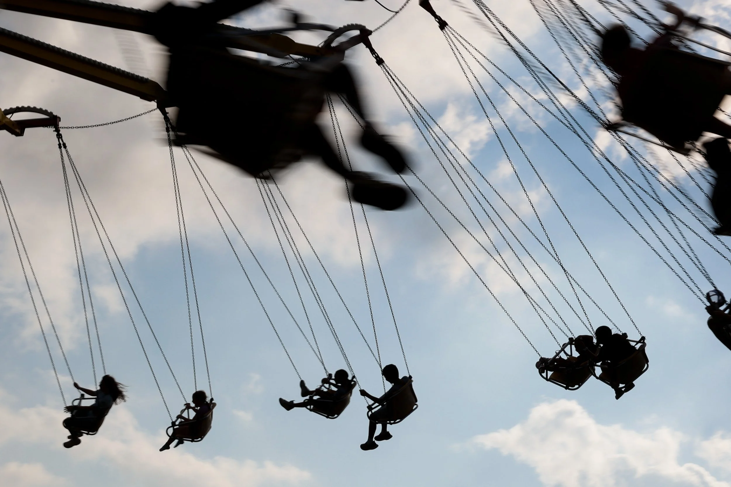 Fair-goers ride the swings during the Mower County Fair on Wednesday, Aug. 6, 2025, in Austin, Minn.