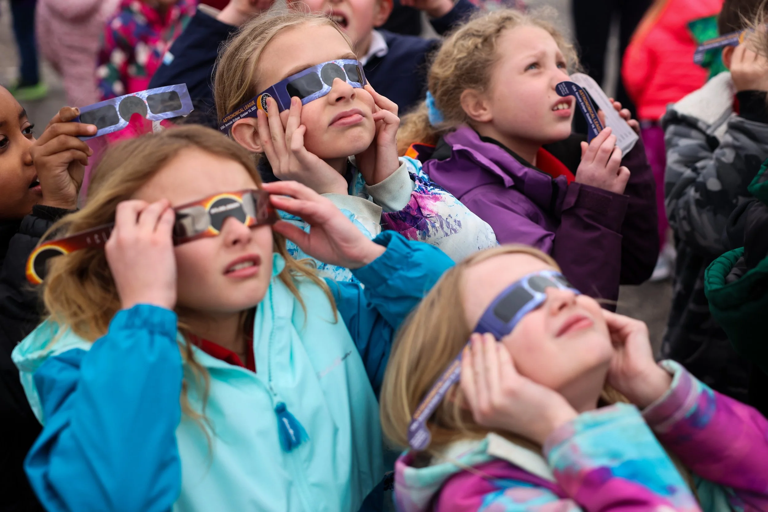 Children from Holy Spirit Catholic School view the solar eclipse on Monday, April 8, 2024, in Rochester, Minn.