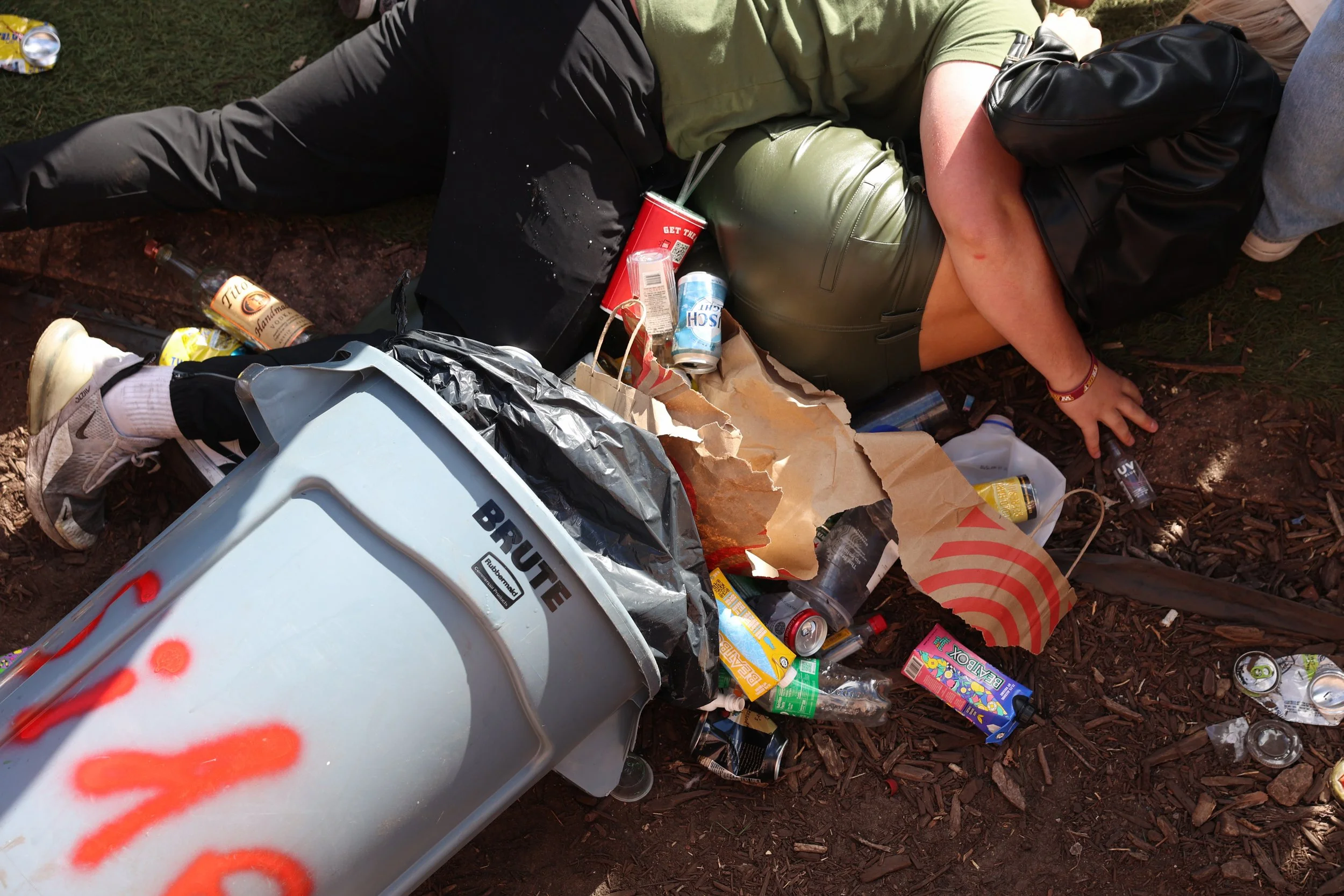 A couple falls on top of the trash cans during a frat party on Saturday, March 16, at the University of Minnesota campus in Minneapolis, Minn.