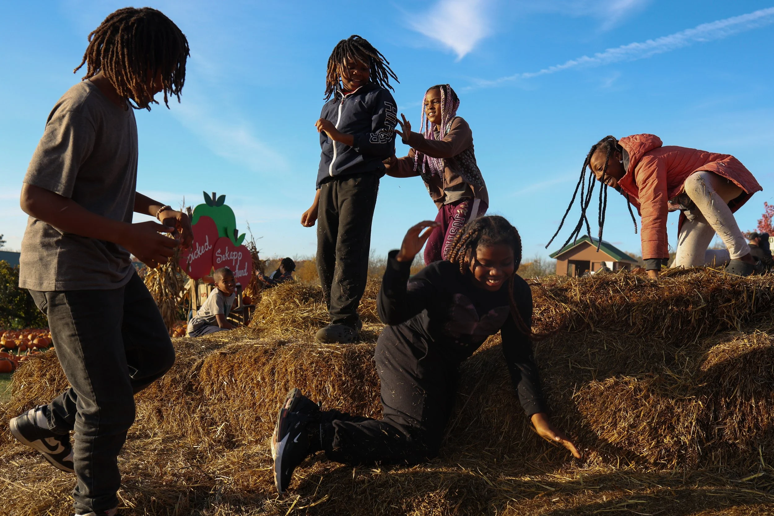 Children play on the hay bales at Sekapp Orchard on Oct. 22, 2023 in Rochester, Minn.