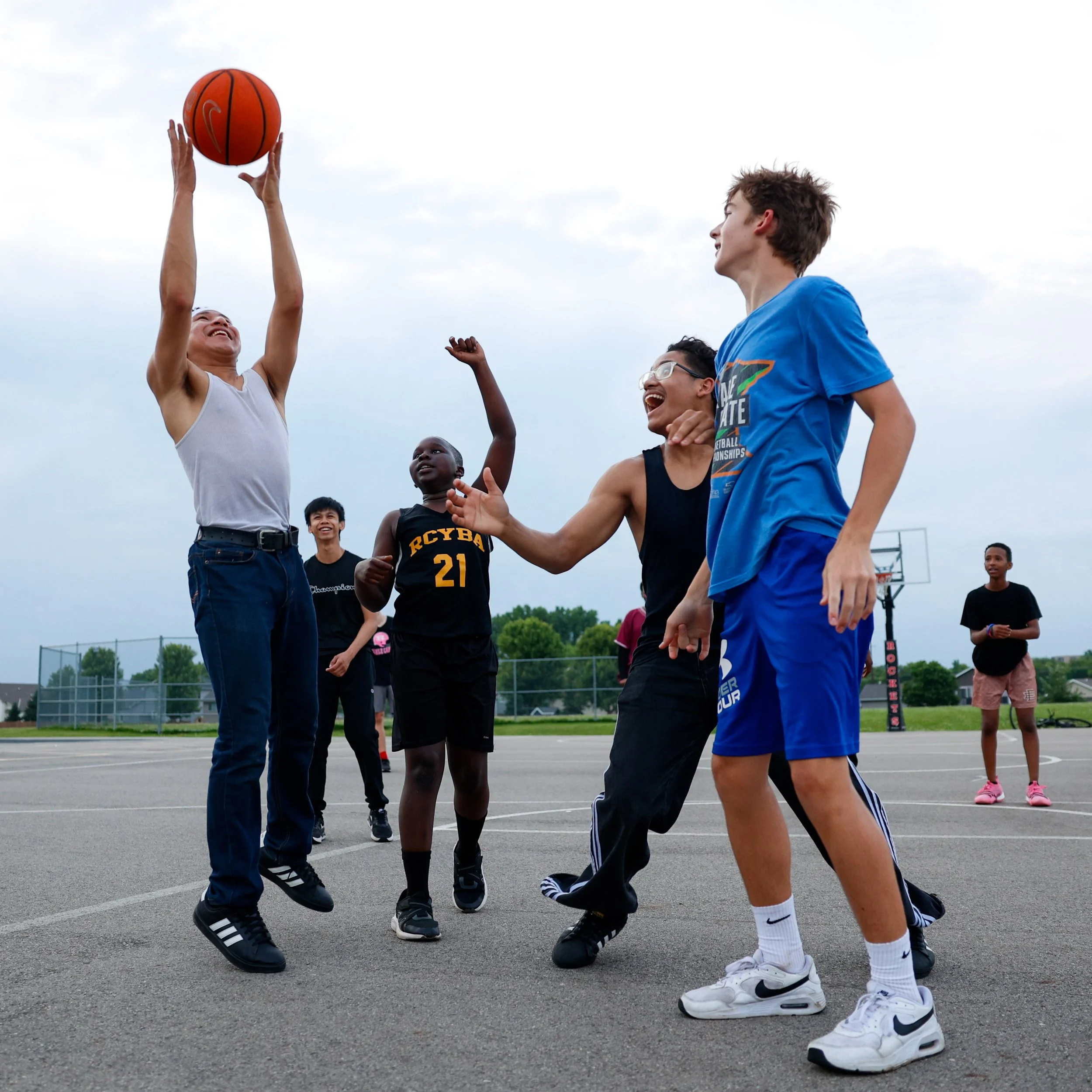 A group of boys play a pick-up game of basketball on Monday, June 16, 2025, at Gibbs Elementary in Rochester, Minn.