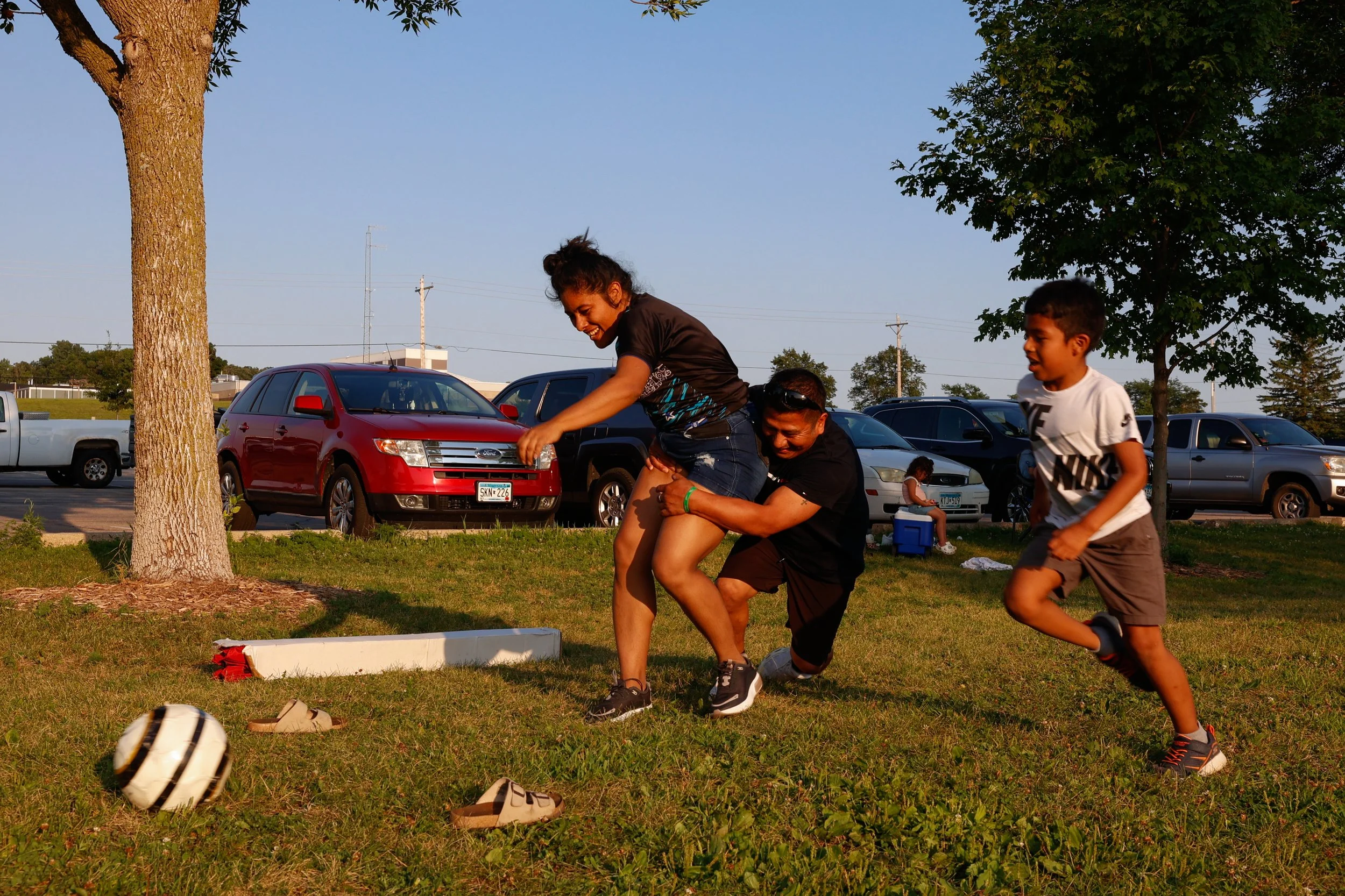Jorge Dominguez, center, tackles Yensy Marquez while Andres Dominguez runs up to steal the ball during a pick-up game of soccer on Monday, July 28, 2025, at Foster Arend Park in Rochester, Minn. View fullsize