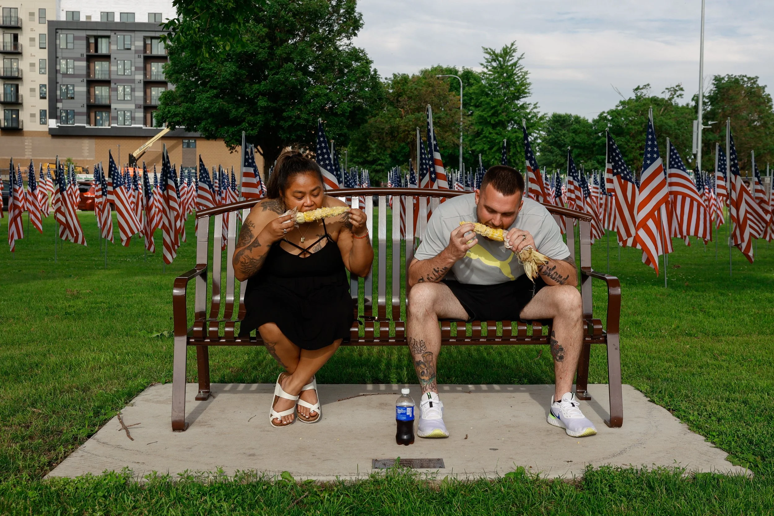 Ali and Joshua Beach enjoy corn on the cob in front of the flag field during Rochesterfest on Tuesday, June 24, 2025, at Soldiers Field Park in Rochester, Minn. View fullsize