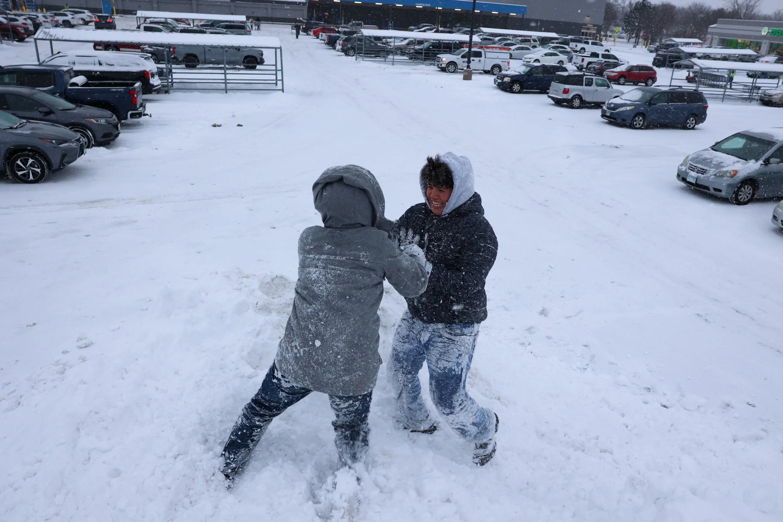 Jadden Mendoza, left, and Oliver Gasca wrestle in a parking lot snow pile on Thursday, Dec. 19, 2024, outside of the Sam’s Club in Rochester, Minn.