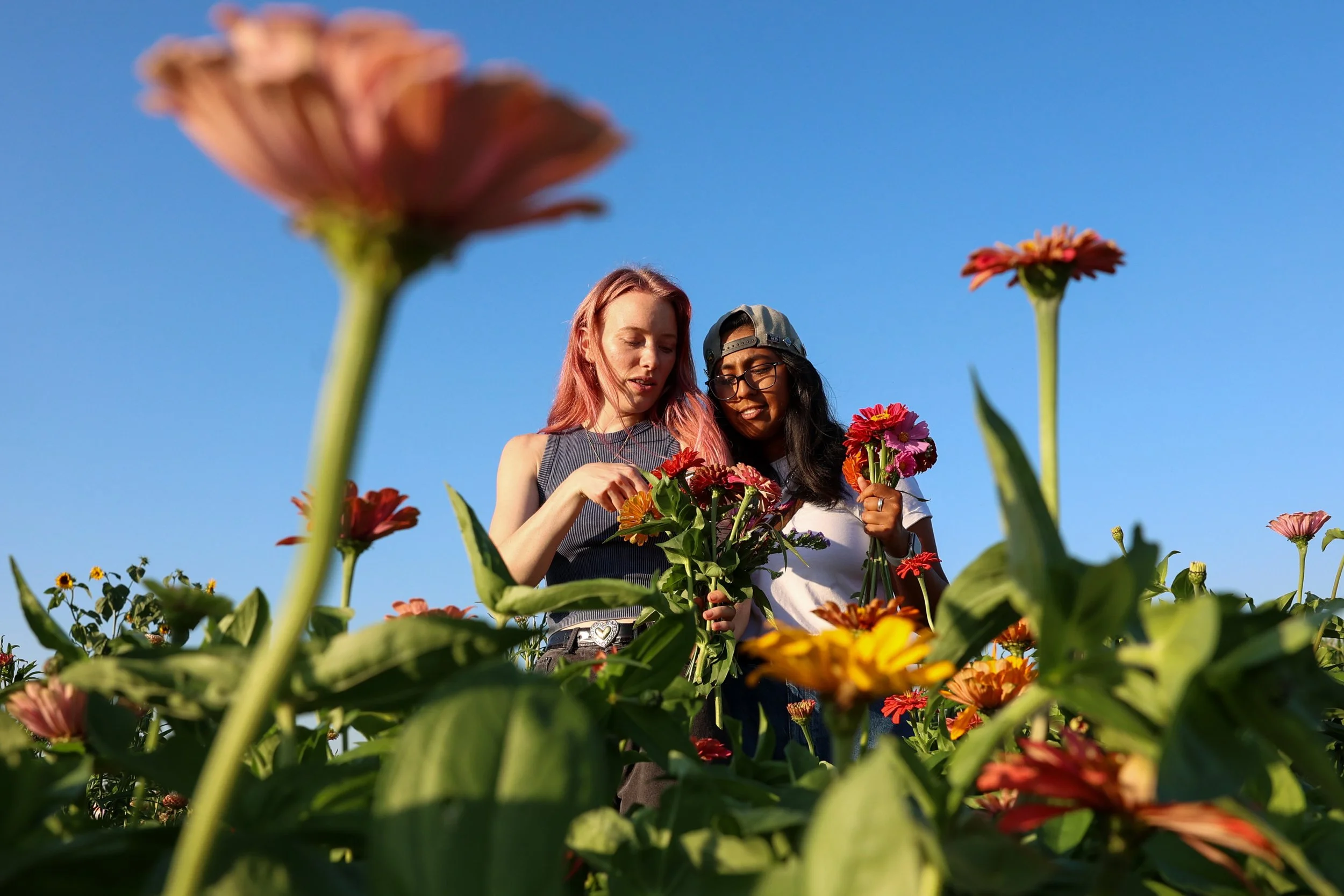 Angalee Schmidt, left, and Janita Kumar add flowers to their bouquets during a Sips and Snips community event hosted by Fischer Hill Flowers in collaboration with Whitewater Wines and Courtney’s Charcuterie on Friday, Aug. 2, 2024, in Plainview, Minn.
