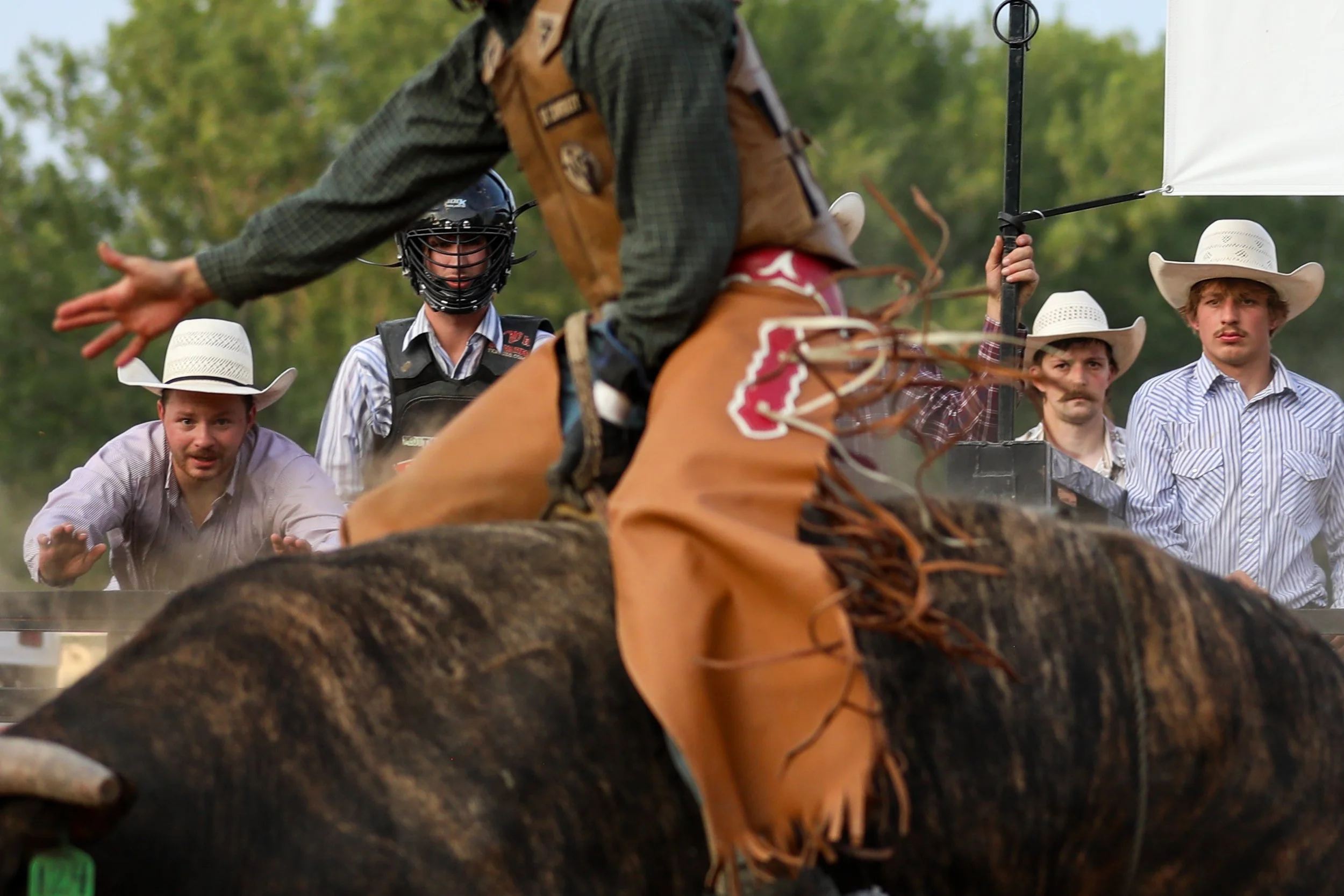 Cowboys watch Hunter Ball compete in the bull riding competition during the Wabasha County Fair on Friday, July 19, 2024, at the Wabasha County Fairgrounds in Wabasha, Minn.