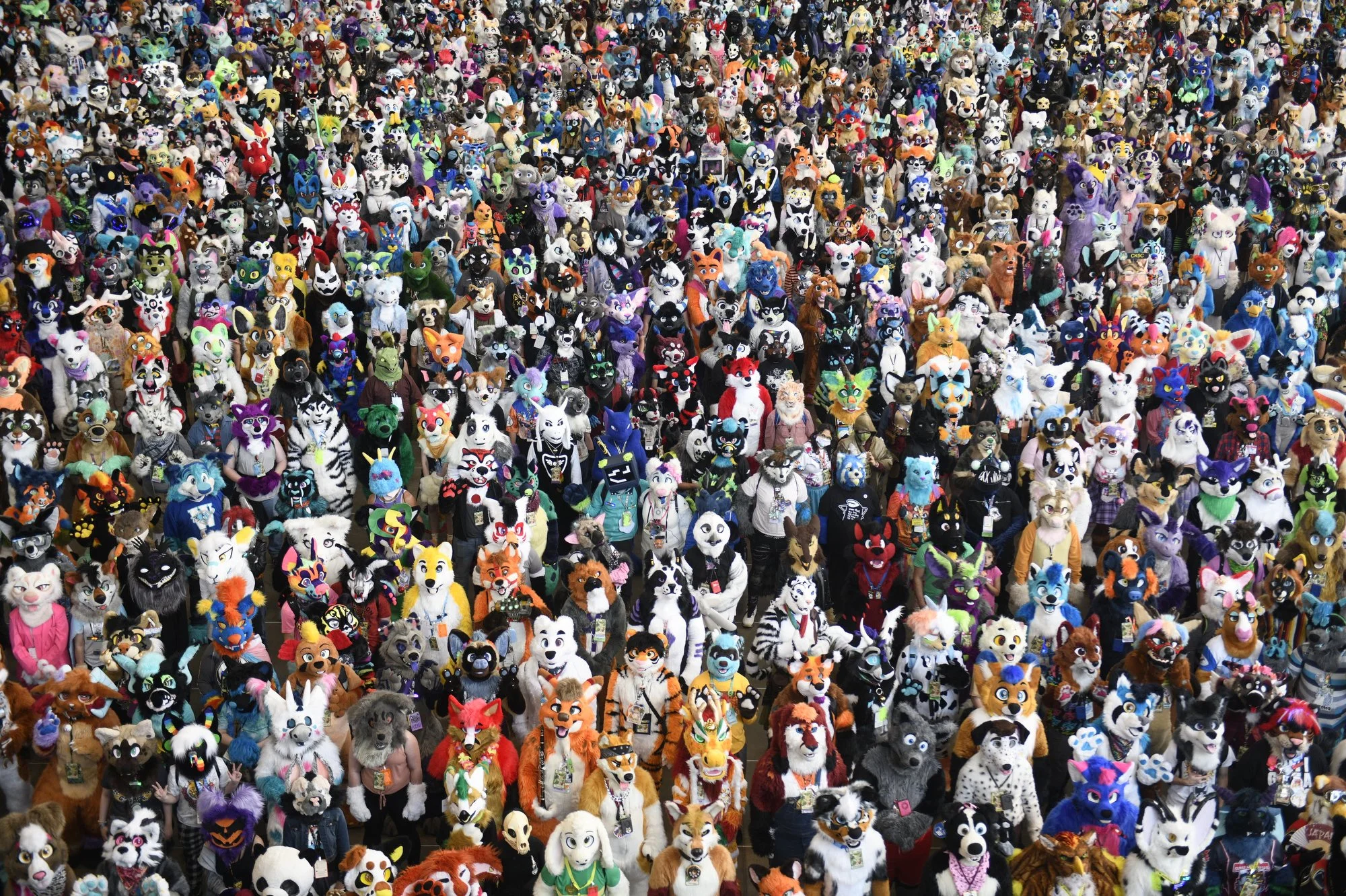 Furries pose for the annual Fursuit Group Photo at the Anthrocon Convention at David L. Lawrence Convention Center on Saturday, June 2, 2022, in downtown Pittsburgh, Pa. Furries shut down the street of Penn Ave., between 9th and 11th St., for their a