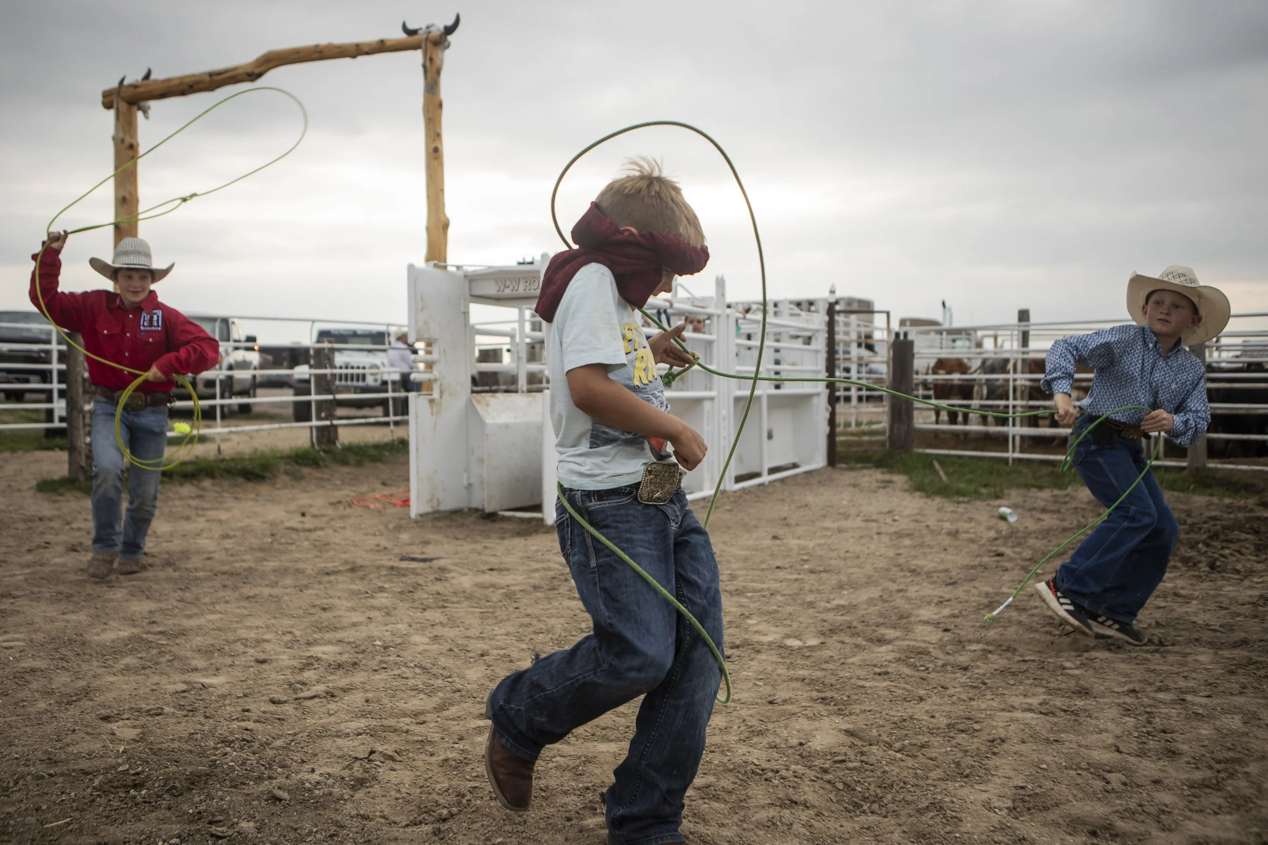 Three boys pretend to rope each other on Thursday, June 22, 2023, at the Kadoka Buffalo Stampede Rodeo in Kadoka, S.D.