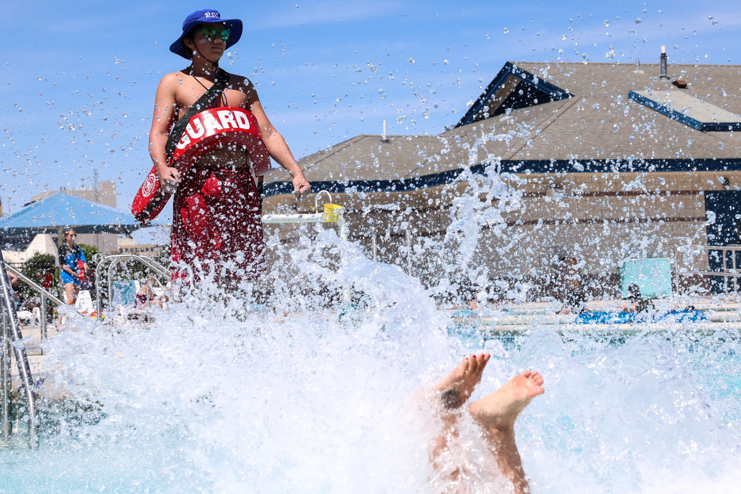 Jyson Lee gets splashed as people exit the slides at the new Soldiers Field Aquatic Center’s opening day on Monday, June 10, 2024, in Rochester, Minn. View fullsize